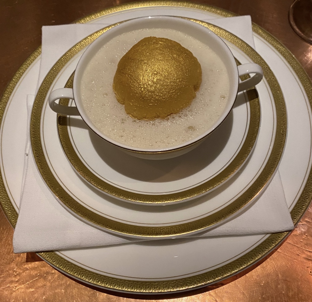 See a large golden egg floating in a cloud of white foam in a white gold-rimmed bowl, upon a low pagoda of stacked white gold-rimmed porcelain—saucer, plate, and charger. You are at NEXT Restaurant in Chicago.
