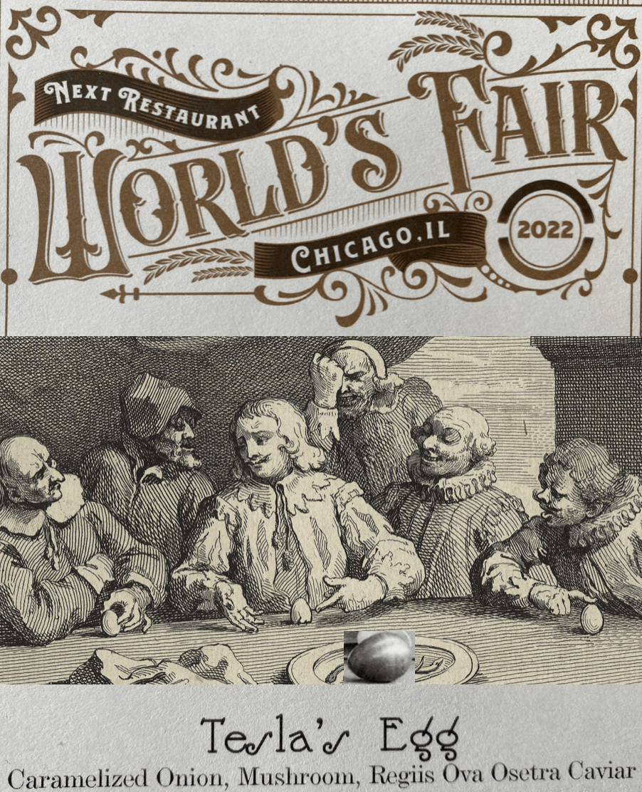 Especially inspiring is the experience of eating NEXT’s “Tesla’s Egg.” You break open its gleaming metallic shell by tapping it with the back of your spoon. For a moment the spoon is not for scooping but for striking, not a little shovel, but a hammer. For a moment, a tool you had taken for granted is used in a new way and seen in a new light. How many things we take for granted today were introduced at the World’s Fair in Chicago: the zipper and the light bulb inspire later courses on NEXT’s menu, as do the first hamburger, crackerjacks, Pabst Blue Ribbon beer, and the introduction of medicinal cod liver oil (mmm, delicious—I’m serious!). Most famously the Columbian Exhibition featured the Ferris Wheel, Chicago’s answer to the Eiffel tower in Paris. NEXT saves this for dessert. I will say no more about its spectacular presentation, but return to savoring “Tesla’s Egg.”